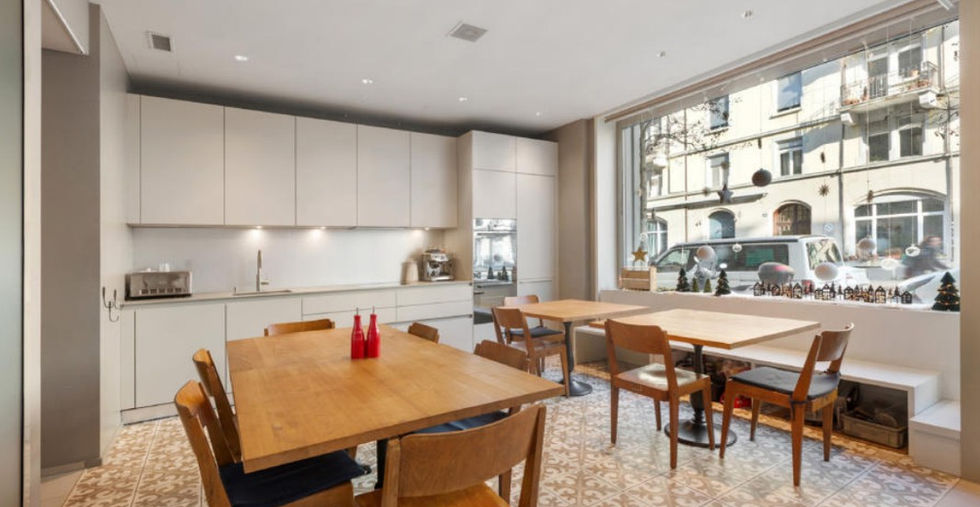 La espaciosa zona principal, de aproximadamente 63 m², disfruta de abundante luz natural gracias a sus grandes ventanales y vitrinas, creando una agradable conexión con el exterior sin comprometer la privacidad. Su ubicación en planta baja garantiza una excelente visibilidad y fácil acceso. El elegante suelo de parqué, las líneas depuradas y los armarios empotrados crean un entorno de trabajo sofisticado y funcional.